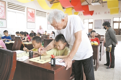 暑期,我市“未来乡村”试点村——大陈乡早田坂村,利用村文化礼堂开办书法、绘画等学生暑期课堂,邀请本地退休教师进行免费授课。图为退休教师郑振根在教授35名留守儿童学习书法。 (江陈宣 摄)