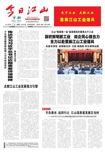 在坚决打好打赢“十四五”收官攻坚战的重要节点,2025年江山市工业大会暨高质量发展建设共同富裕示范区推进会隆重召开,这是我市第一时间贯彻落实全省、衢州“新春第一会”精神的一项有力举措,也是我市连续第四年聚焦“工业强市、产业兴市”主题主线,持续大干工业、大抓工业的一次全面动员。
