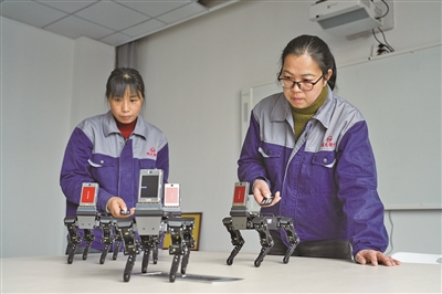 3月8日,浙江冠文智造科技有限公司工人演示新开发的AI仿生四足机器狗产品。冠文公司是一家专业研发生产科学实验配套玩具、信息技术科教、航天科教等教具成品及配件的科技型企业。目前企业订单充足,今年前两月完成产值同比增长25%。