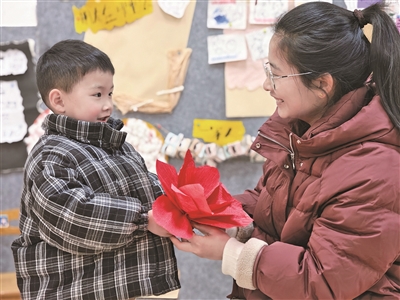 3月6日,贺村镇淤头幼儿园开展“巧手扎红花 童心献妈妈”主题活动。孩子们制作大红花送给妈妈,为妈妈送上祝福。