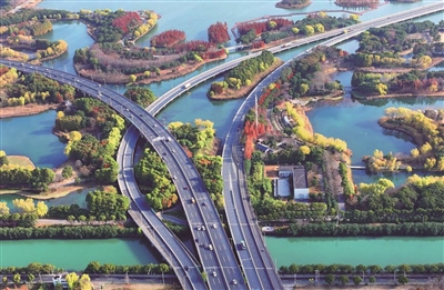 冬至时节,空中俯瞰蓝天白云掩映下的江苏省苏州市虎丘湿地公园,层林尽染,色彩斑斓,构成了一幅壮美的生态湿地画卷。